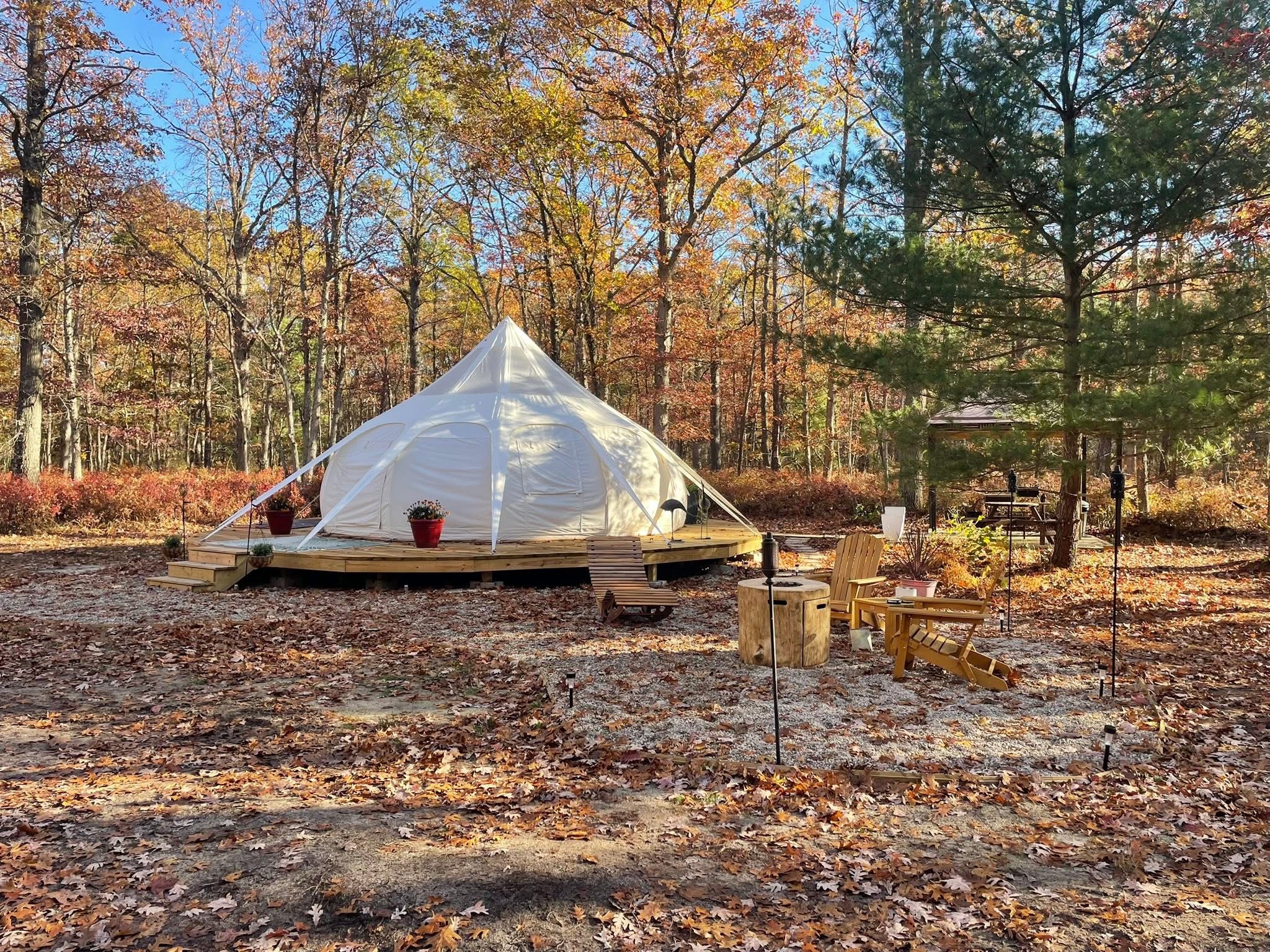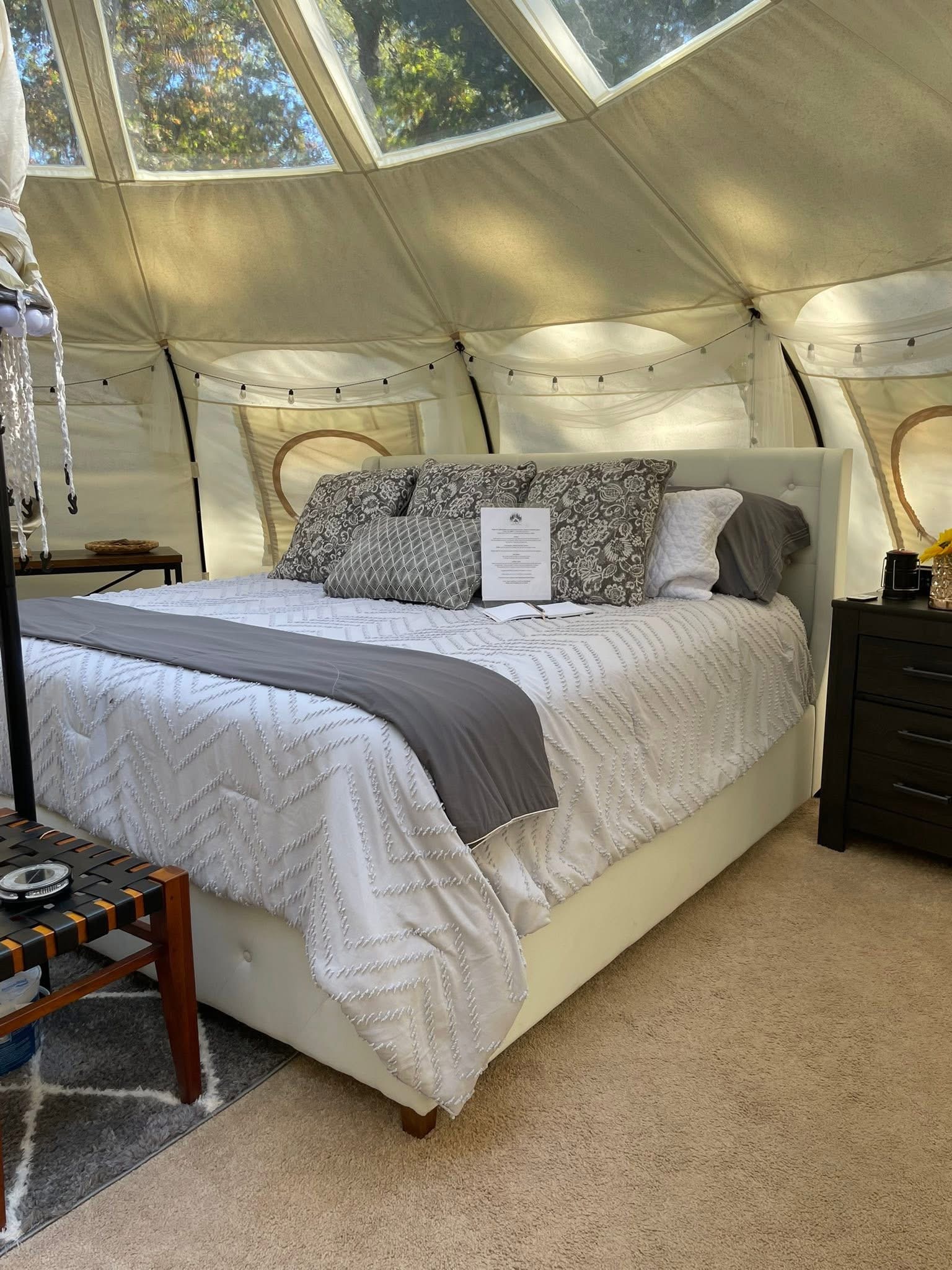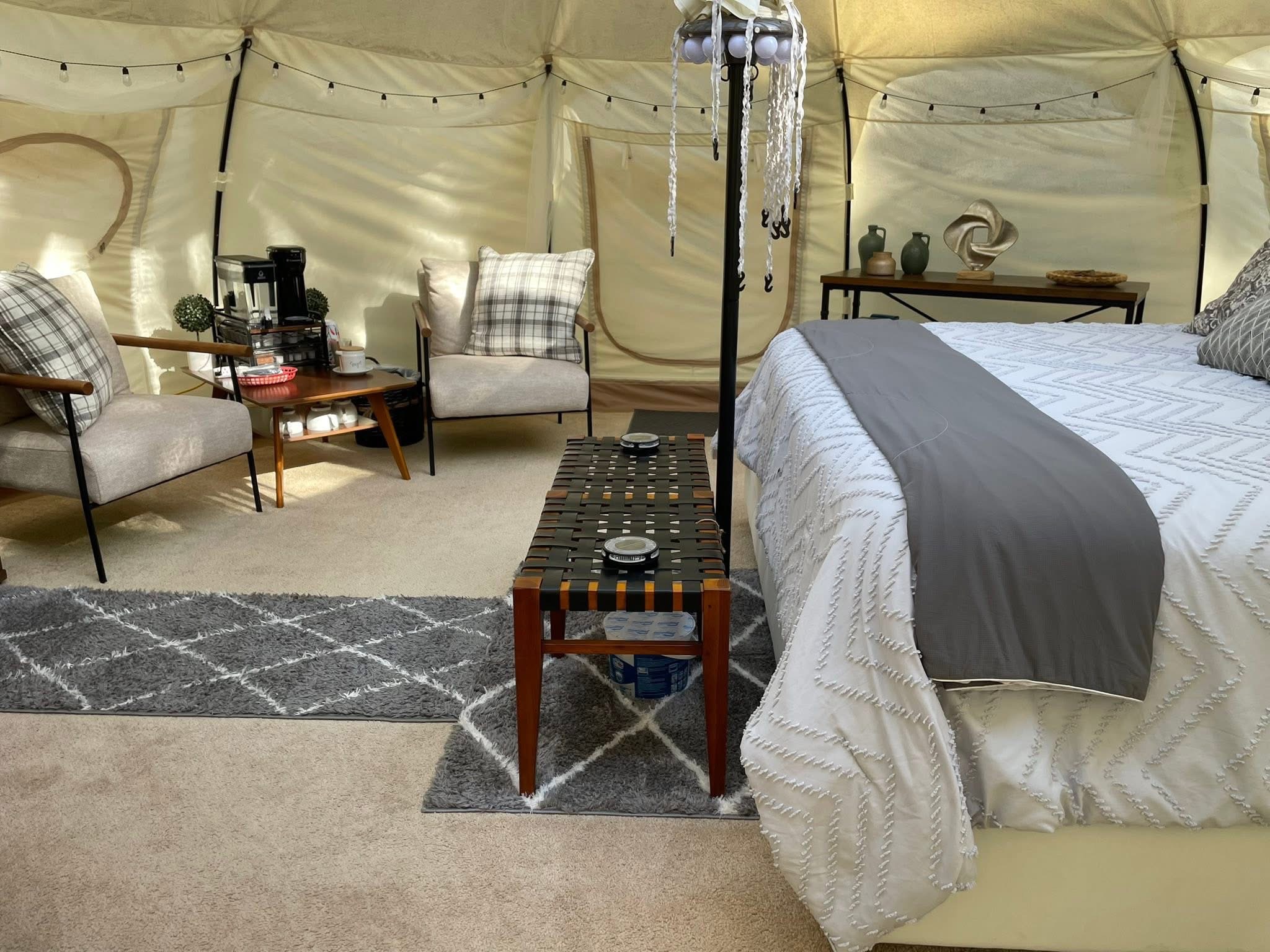 Enjoy a very unique setting! Yurt is nestled in serene woods with all the noise of the wilderness. Enjoy the privacy of being in the woods with a very cozy setting! Solar runs all power so it’s “rustic”. King size bed, coffee maker, toilet/sink and propane heat.
